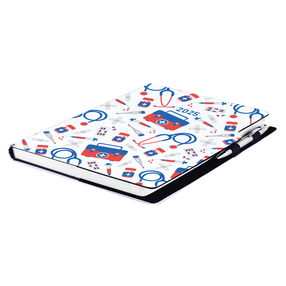 Diár obsahuje: okrúhle odtrhávcie rožky, bielu záložku a pero