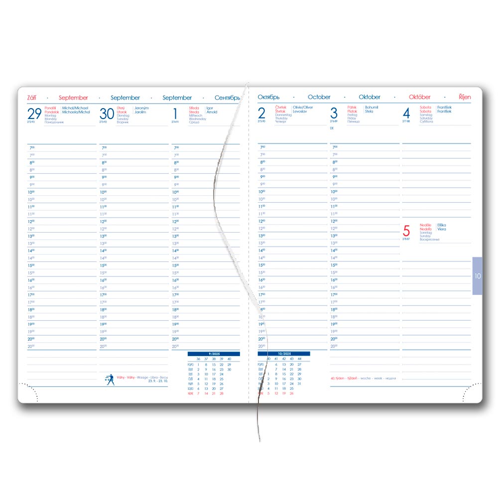 Formát: B6 Rozmer bloku: 120 x 165 mm Rozsah: 144 stran Väzba: šitá V8 (tkaná niť) Kalendárium: týždenné české a slovenské menné Jazykové mutace: CZ, SK, EN, DE, RU Farba bloku: biela Farba písma: modrá a červená Diár obsahuje: okrúhle odtrhávci