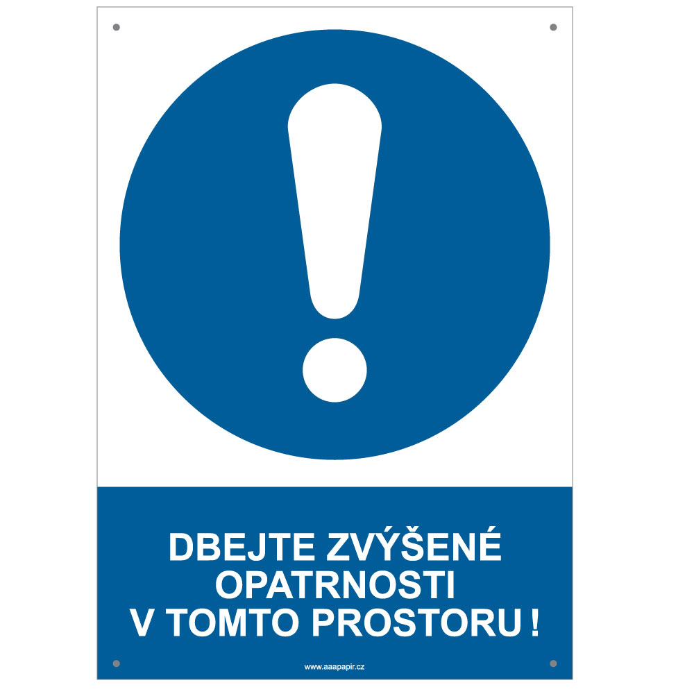 DBEJTE ZVÝŠENÉ OPATRNOSTI V TOMTO PROSTORU! - bezpečnostní tabulka s dírkami, plast A4, 2 mm