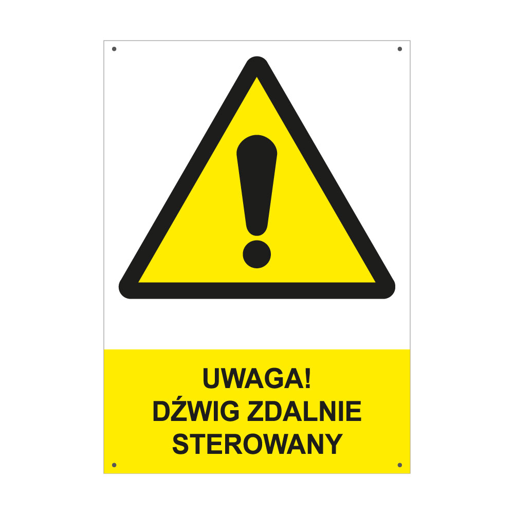 UWAGA! DŹWIG ZDALNIE STEROWANY - znak BHP z dziurkami, płyta PVC A4, 2 mm