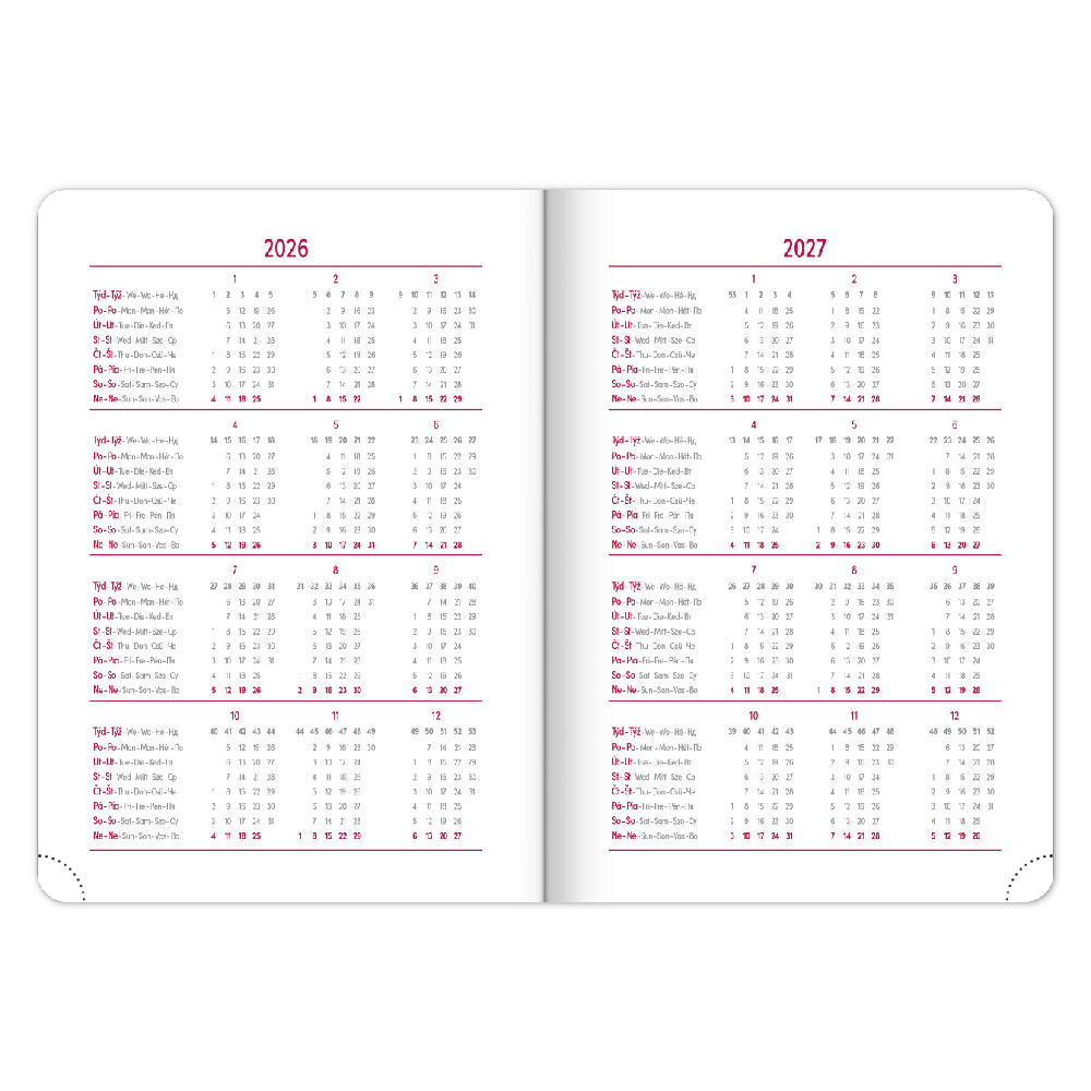 Diár obsahuje: miesto pre osobné údaje, mesačné plánovanie 2026 a 2027,