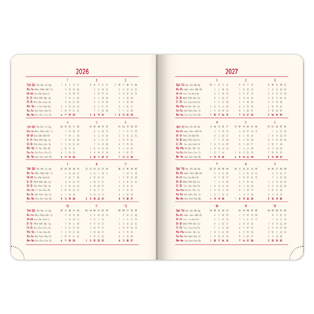 Diár obsahuje: miesto pre osobné údaje, mesačné plánovanie 2026 a 2027,
