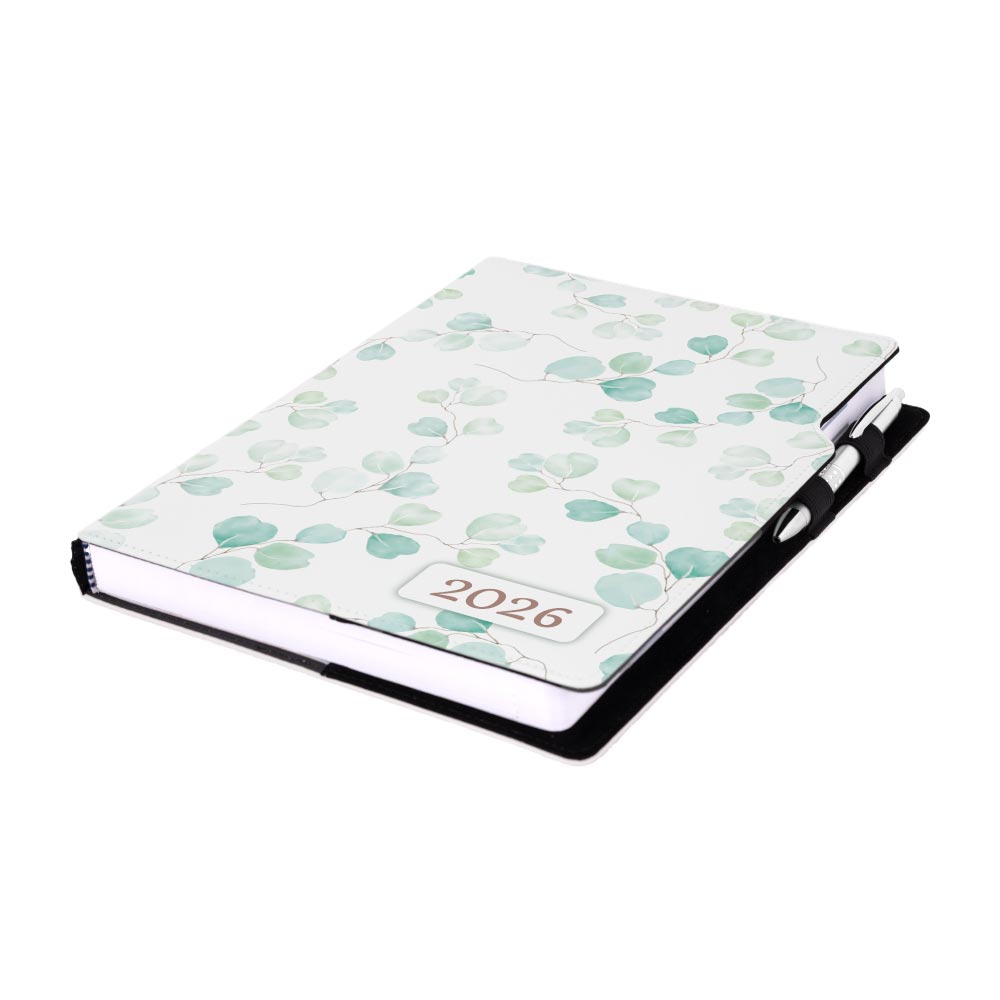 Diár obsahuje: okrúhle odtrhávcie rožky, bielu záložku a pero