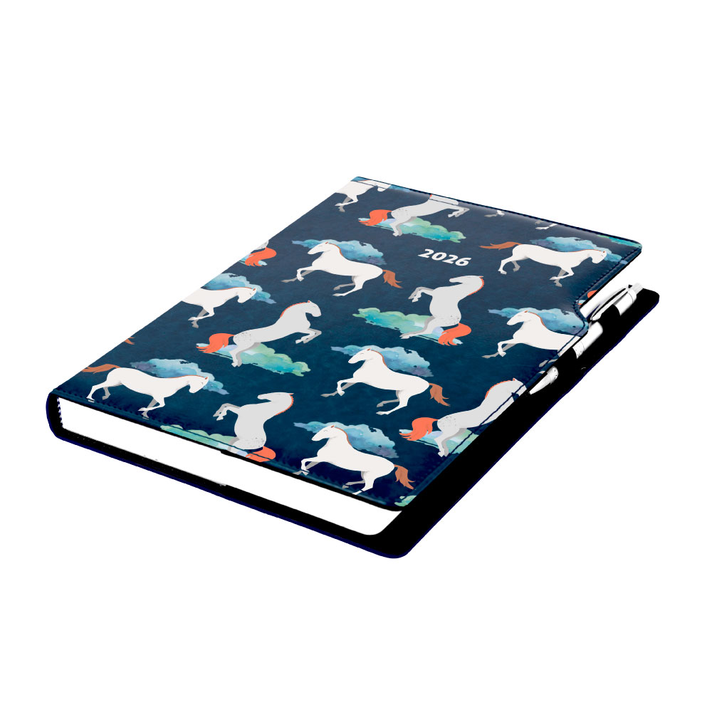 Diár DESIGN denný A4 2026 poľský - modrý - kone
