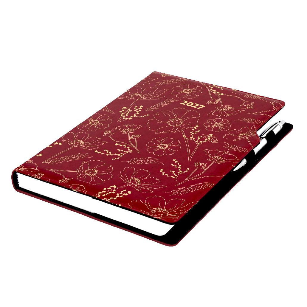 Diár DESIGN denný A4 2027 - bordová - Kvety