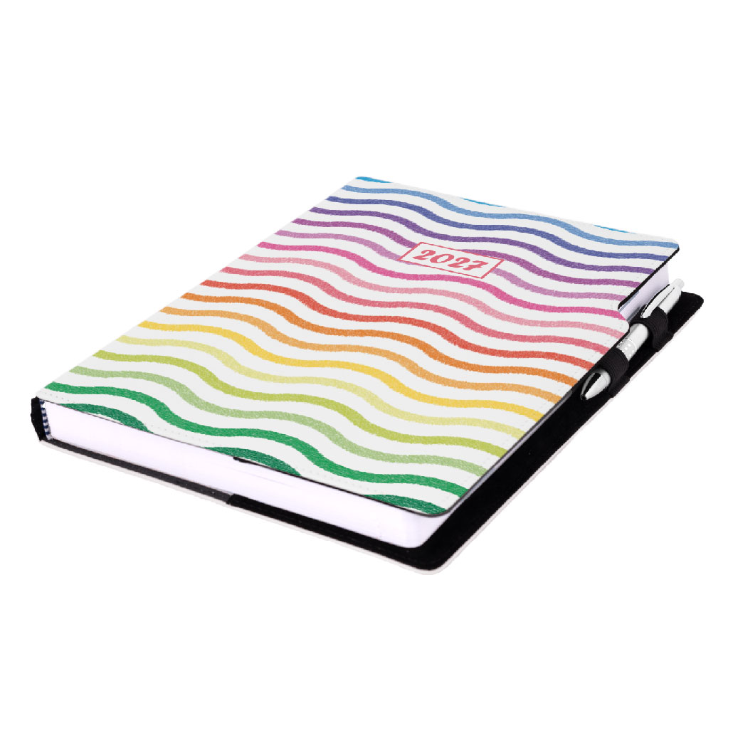 Diár obsahuje: okrúhle odtrhávcie rožky, bielu záložku a pero