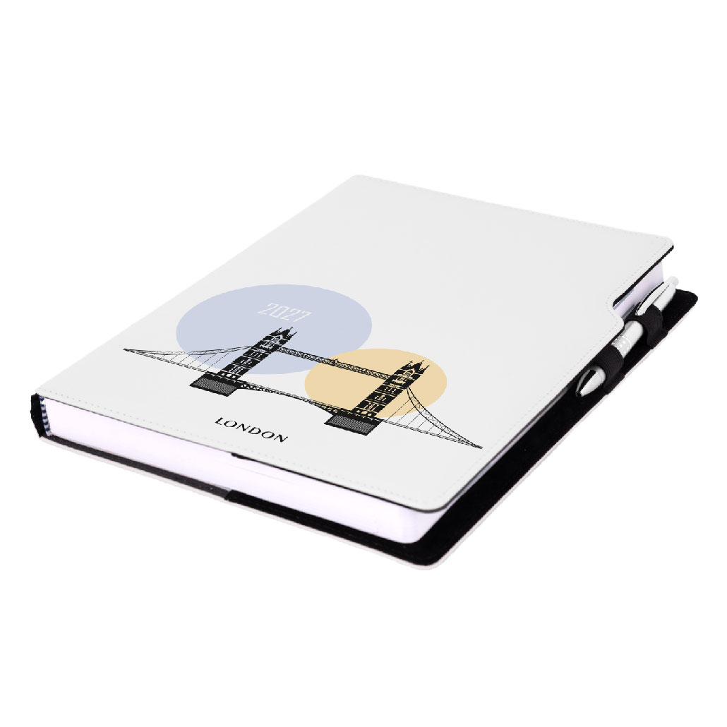 Diár obsahuje: okrúhle odtrhávcie rožky, bielu záložku a pero
