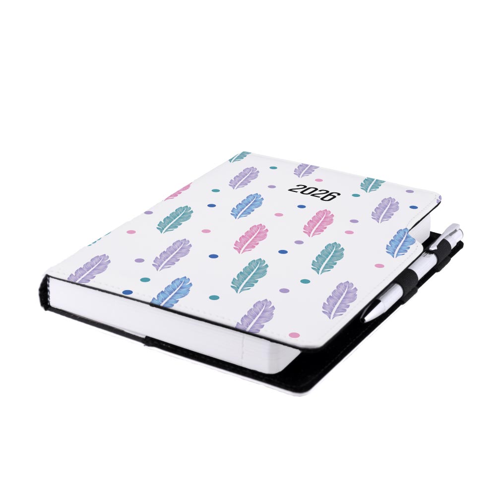 Diár obsahuje: okrúhle odtrhávacie rožky, bielu záložku a pero