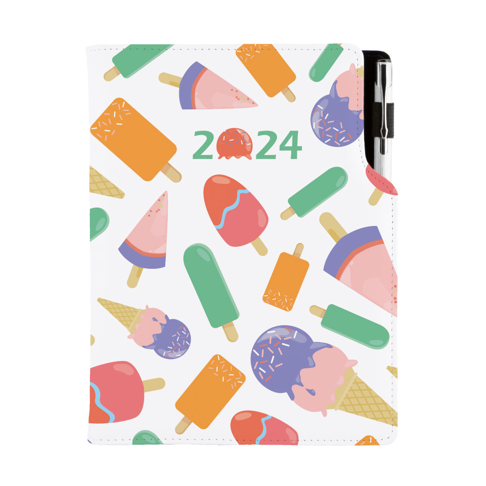 Diár obsahuje: okrúhle odtrhávcie rožky, bielu záložku a pero