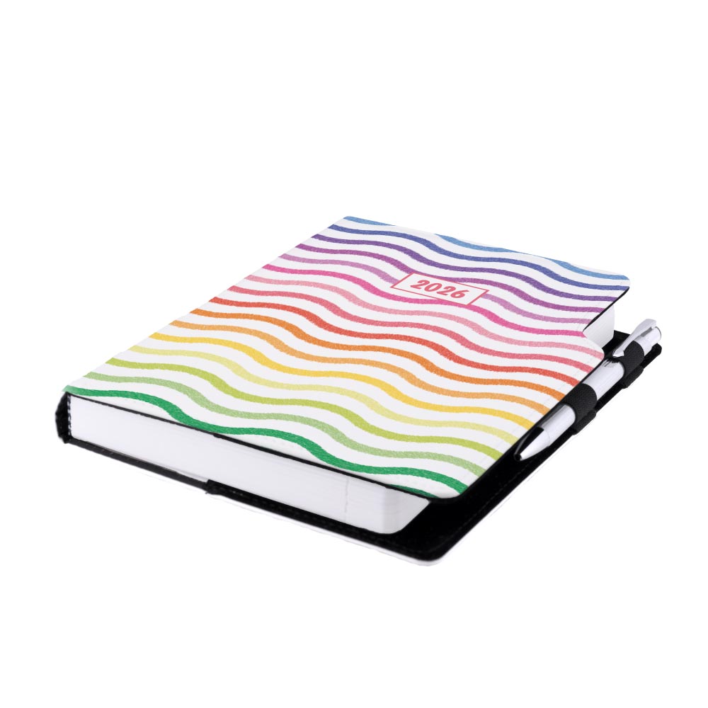 Diár obsahuje: okrúhle odtrhávacie rožky, bielu záložku a pero