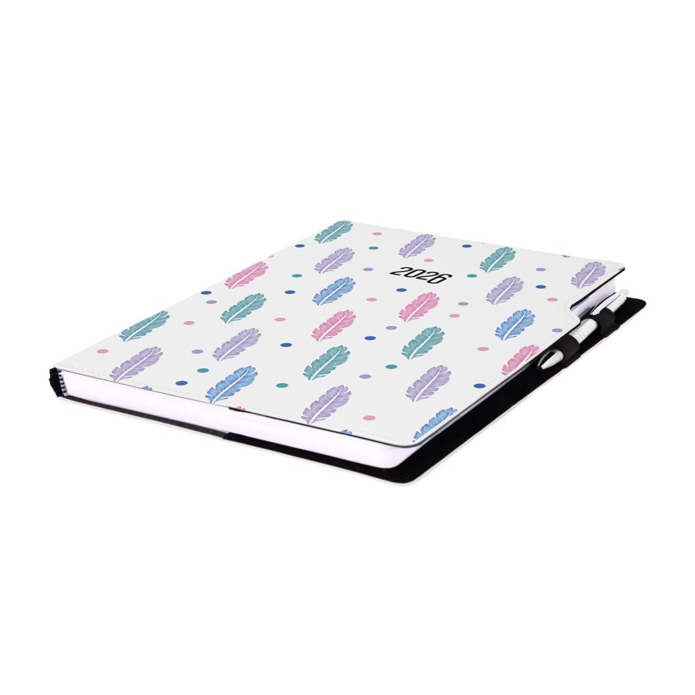 Diár obsahuje: okrúhle odtrhávacie rožky, bielu záložku a pero
