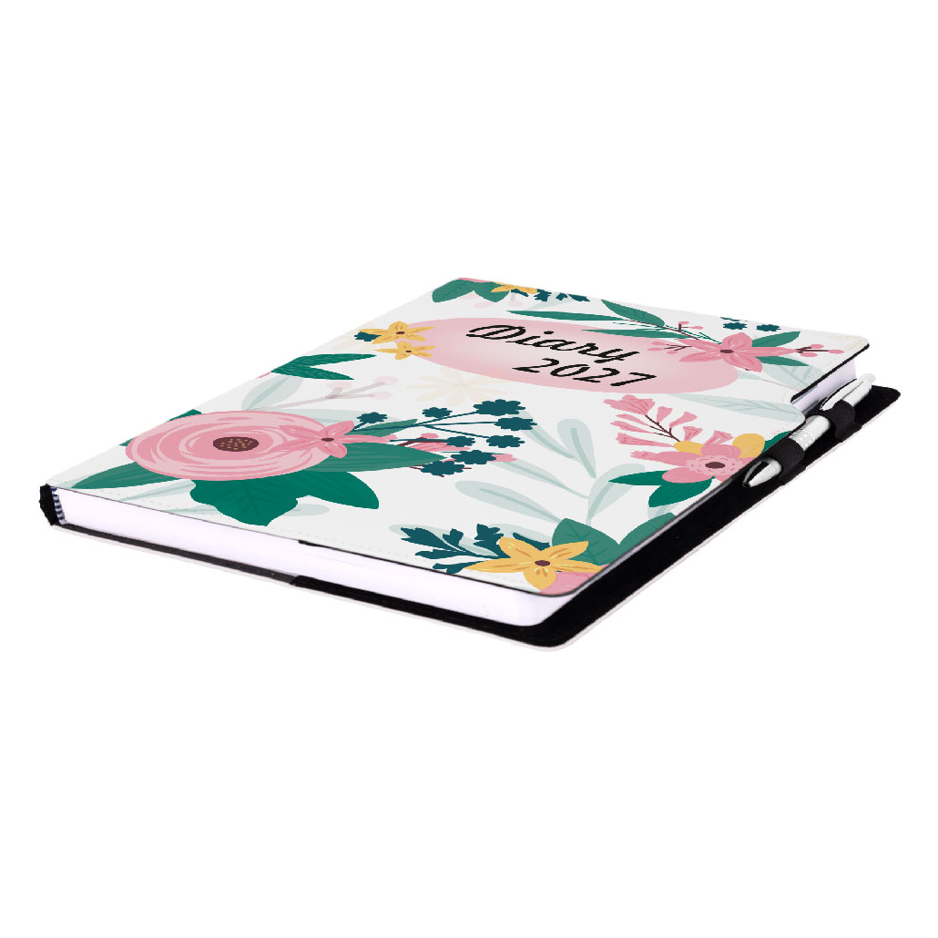 Diár obsahuje: okrúhle odtrhávcie rožky, bielu záložku a pero
