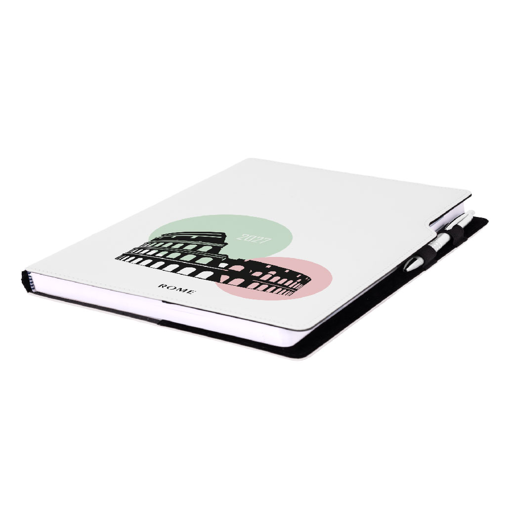 Diár obsahuje: okrúhle odtrhávcie rožky, bielu záložku a pero