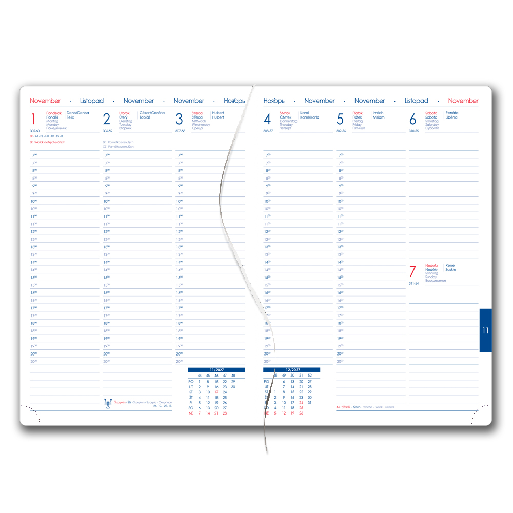 Diár obsahuje: okrúhle odtrhávacie rožky, bielu záložku a pero