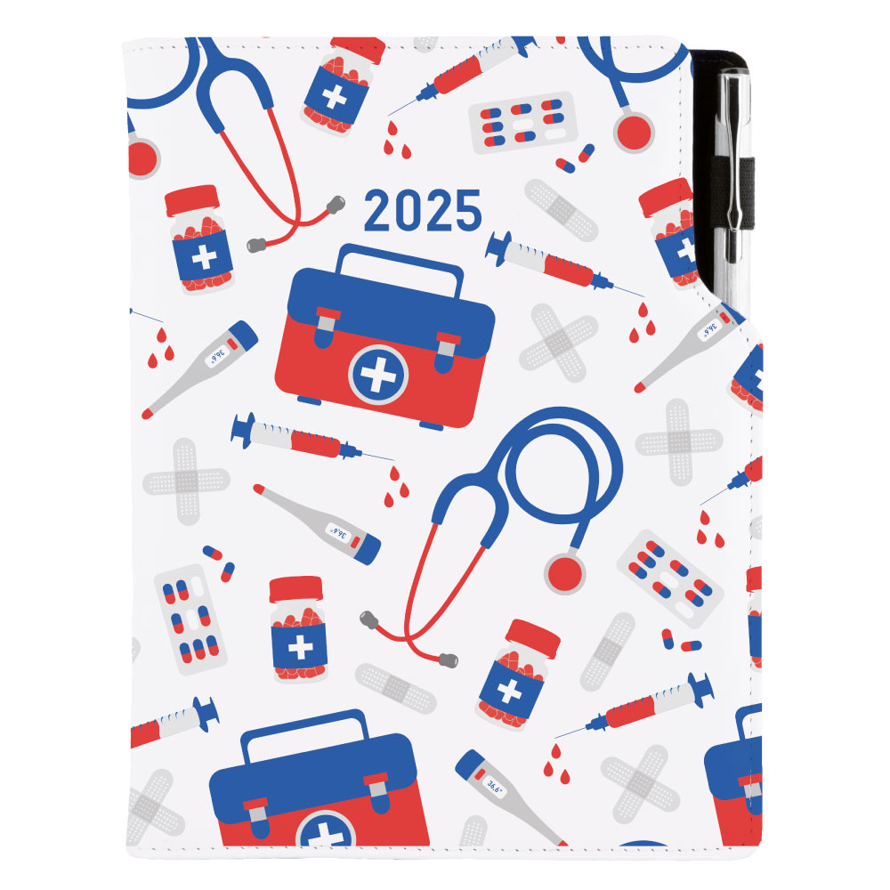 Diár obsahuje: okrúhle odtrhávcie rožky, bielu záložku a pero