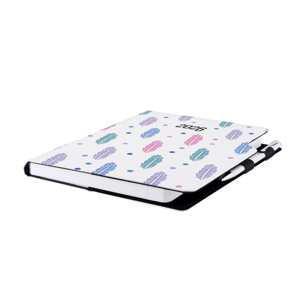 Diár obsahuje: okrúhle odtrhávcie rožky, bielu záložku a pero