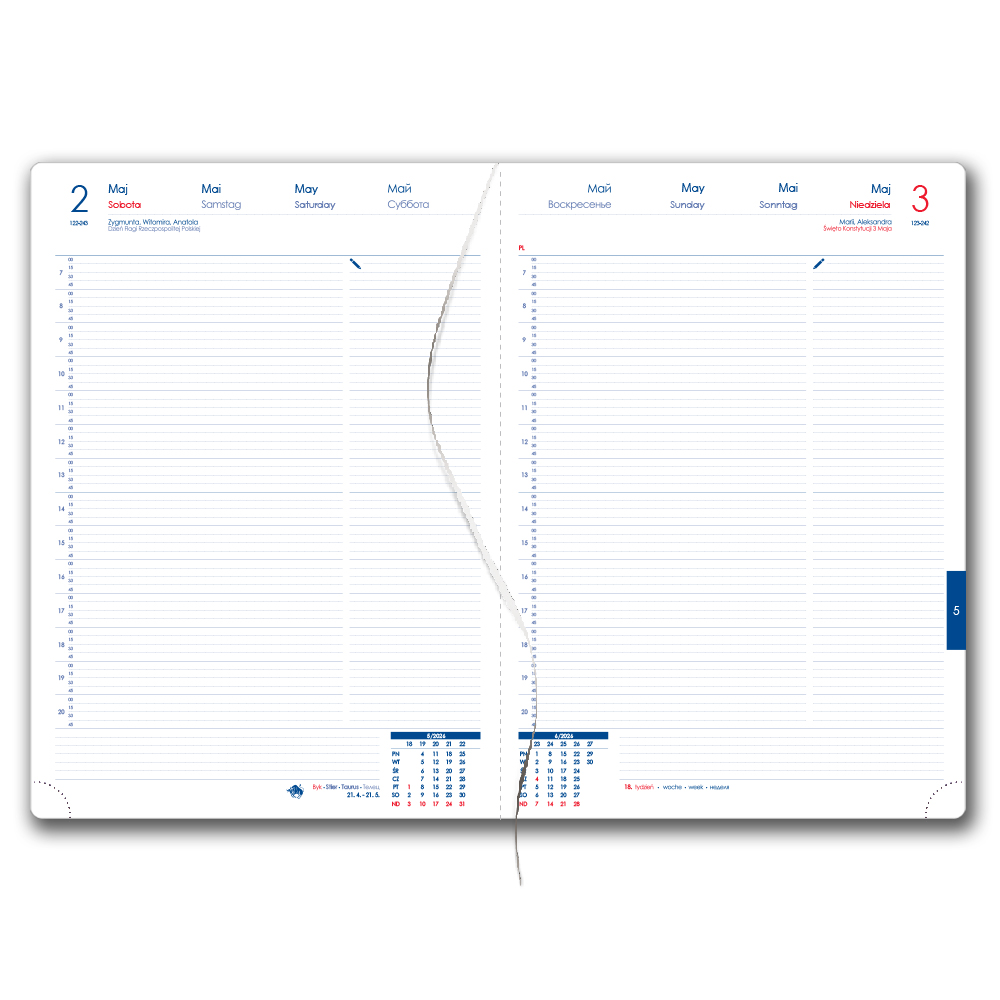 Diár obsahuje: krúhle odtrhávacie rožky, bielu záložku a pero