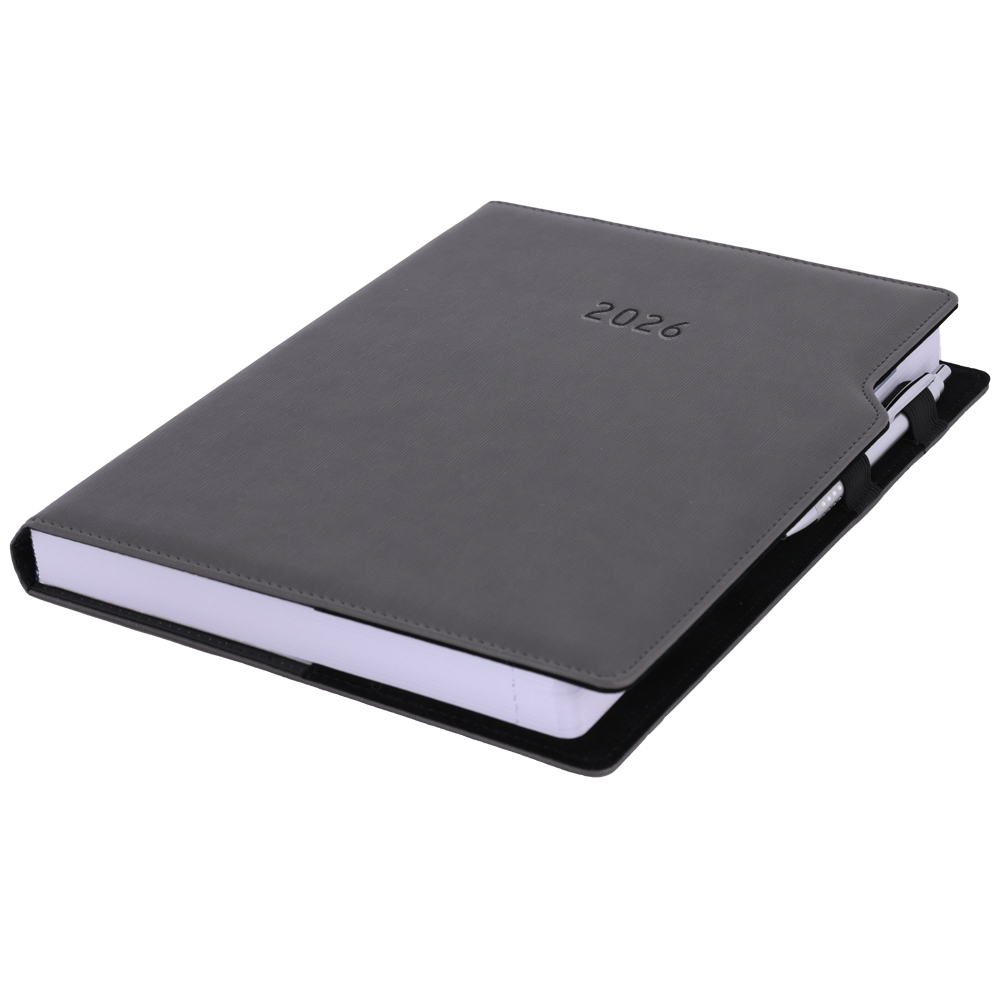 Diár obsahuje: okrúhle odtrhávcie rožky, bielu záložku a pero