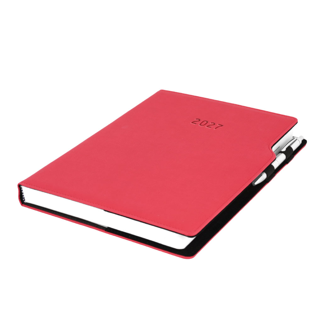 Diár obsahuje: okrúhle odtrhávcie rožky, bielu záložku a pero