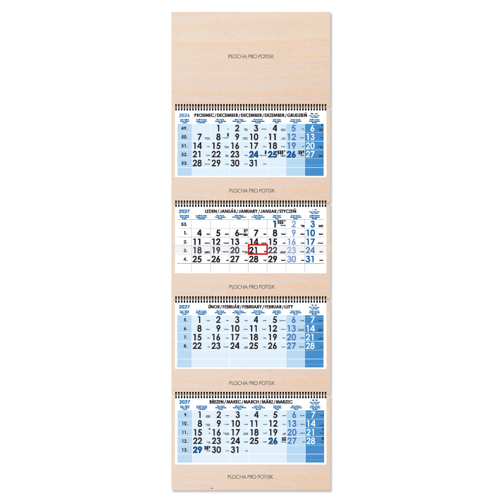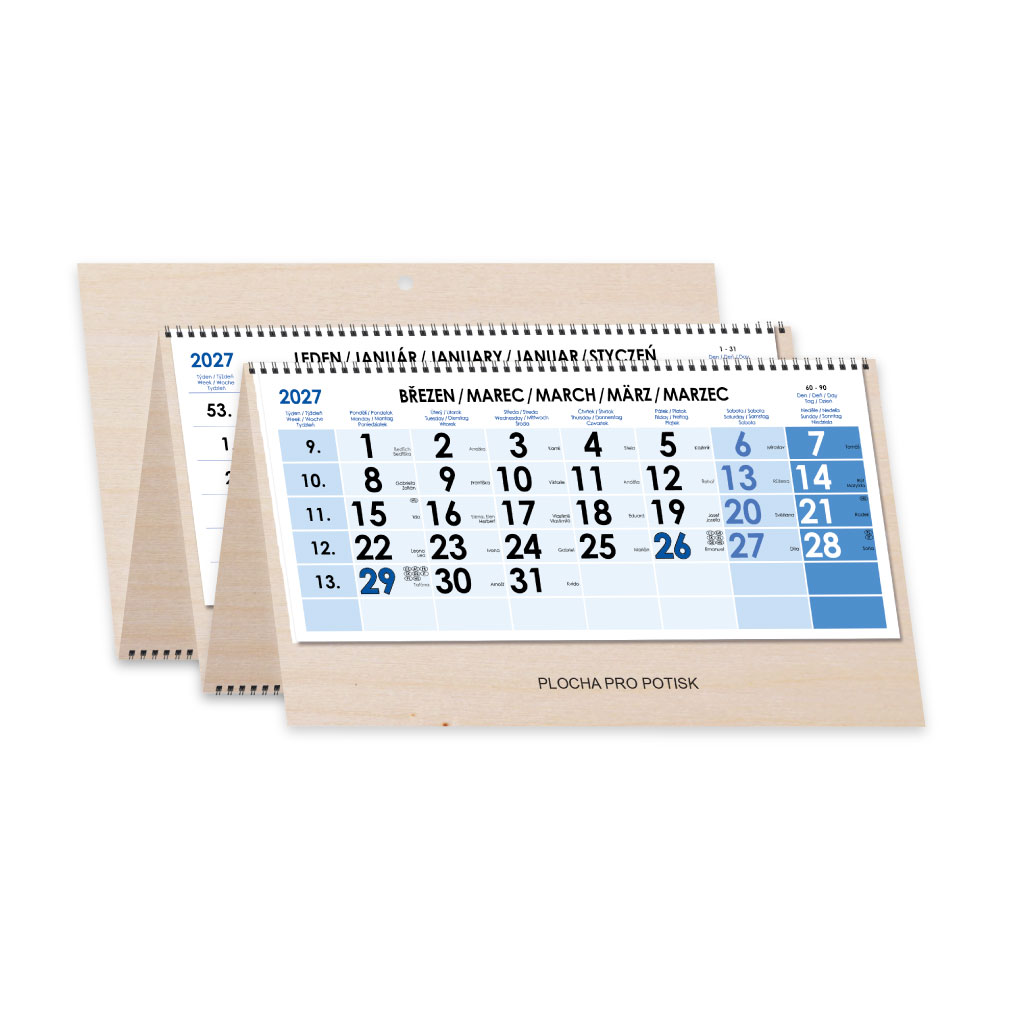 Drevený štvormesačný kalendár Kvatro Wood skládaný český so špirálou 2027 - modrý