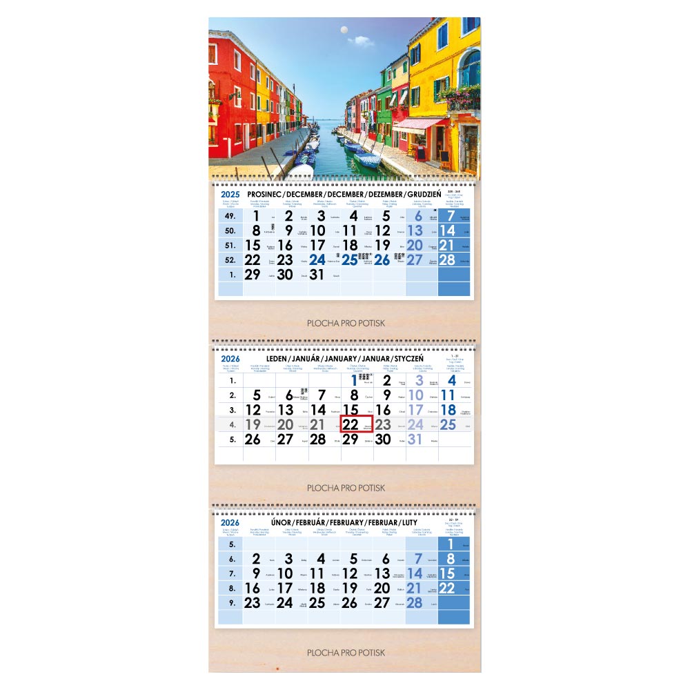 Drevený trojmesačný kalendár Trio Wood Benátky skládaný český so špirálou 2026 - modrý