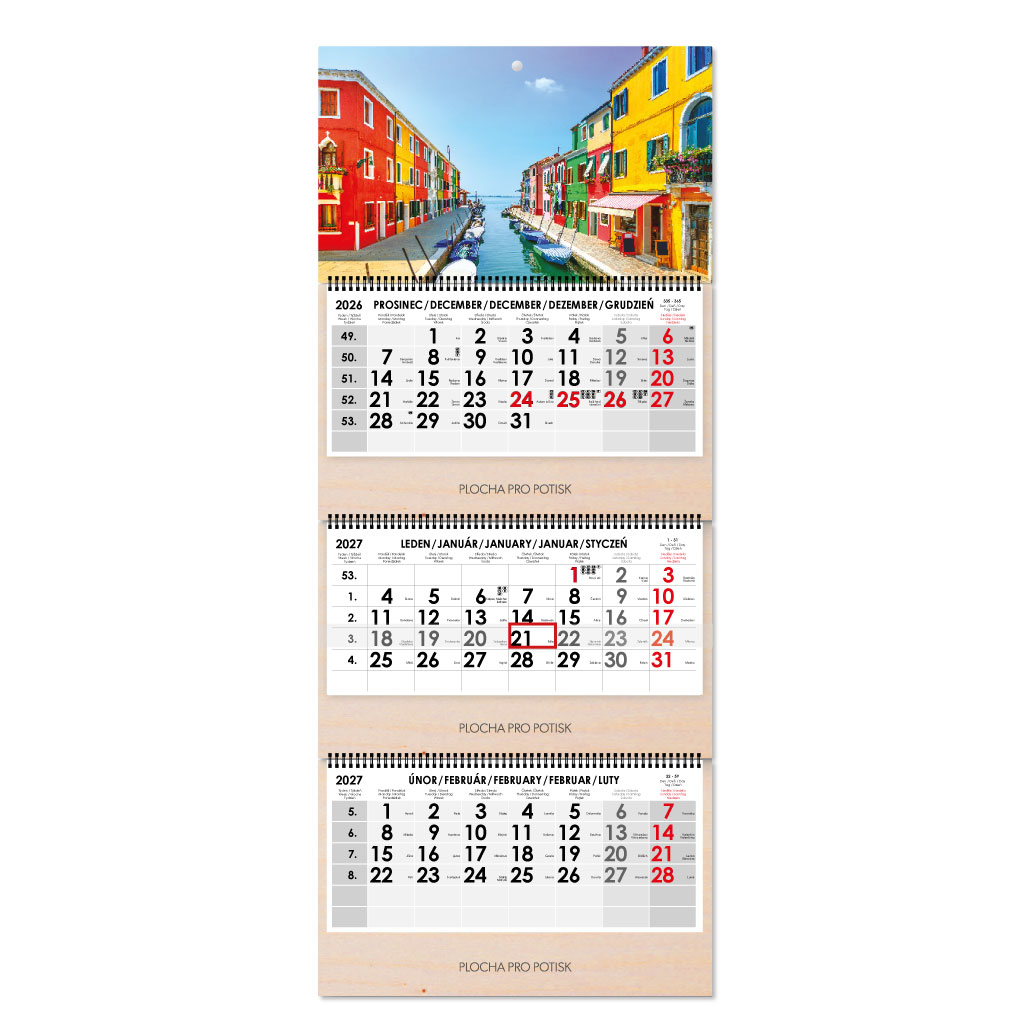Drevený trojmesačný kalendár Trio Wood Benátky skládaný český so špirálou 2027 - sivý