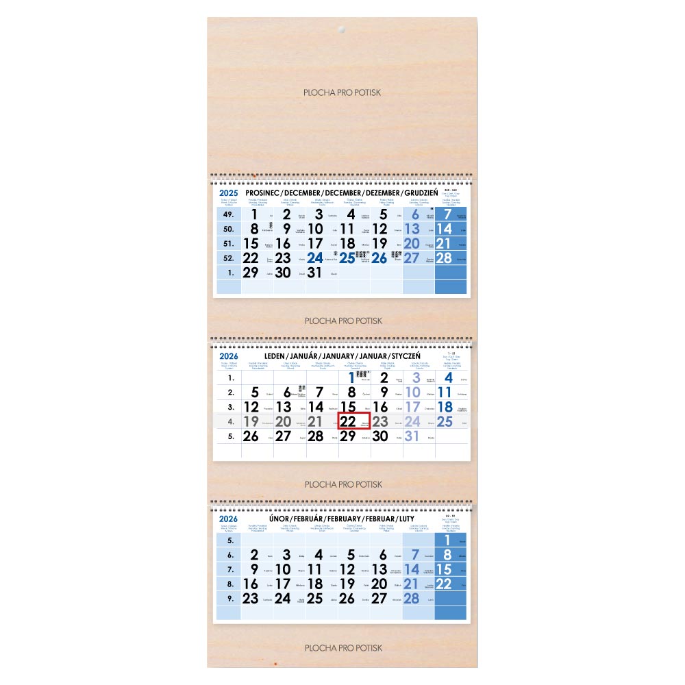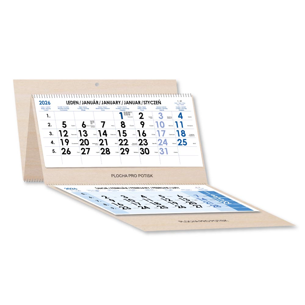 Drevený trojmesačný kalendár Trio Wood skládaný český so špirálou 2026 - modrý
