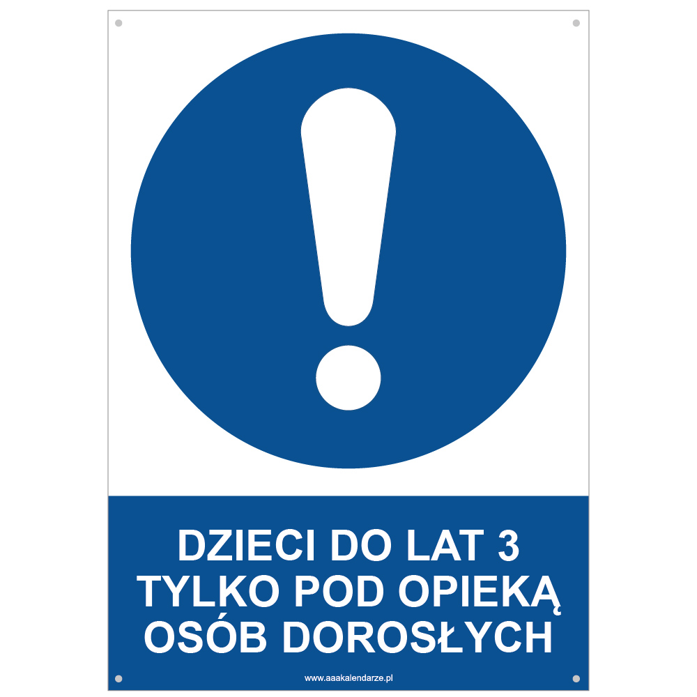 DZIECI DO LAT 3 TYLKO POD OPIEKĄ OSÓB DOROSŁYCH - znak BHP z dziurkami, płyta PVC A4, 2 mm
