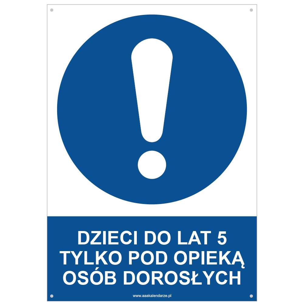 DZIECI DO LAT 5 TYLKO POD OPIEKĄ OSÓB DOROSŁYCH - znak BHP z dziurkami, płyta PVC A4, 2 mm