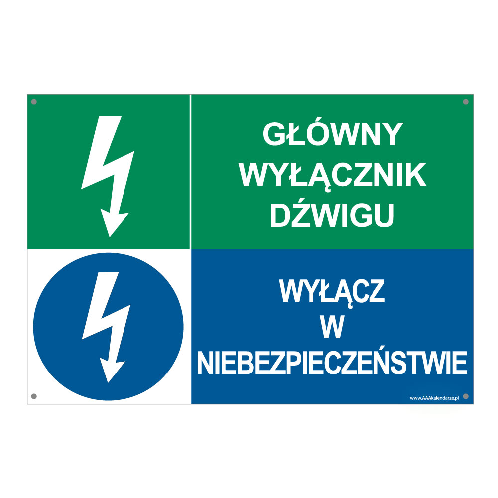 GŁÓNY WYŁĄĆZNIK DŹWIGU - WYŁĄCZ W NIEBEZPIECZEŃSTWIE, ZNAK ŁĄCZONY, płyta PVC 2 mm z dziurkami, 297x210 mm