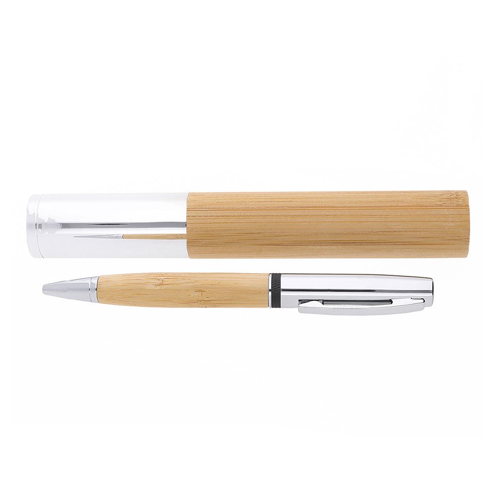 "Elegantné kovové guľôčkové pero s bambusovým telom a lesklými chrómovanými časťami.