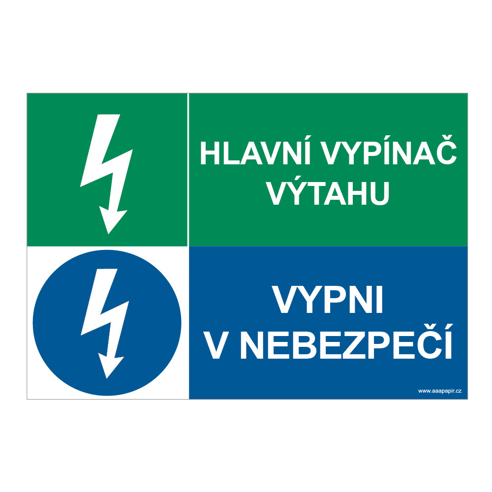Hlavní vypínač výtahu - vypni v nebezpečí, kombinace, samolepka a4