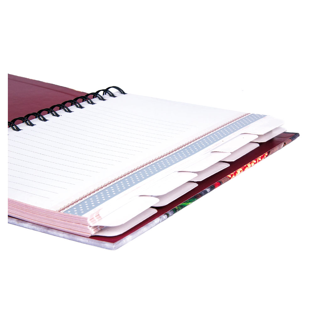 Väzba: krúžková väzba, pevné dosky, mašľou priprevnená vareška
