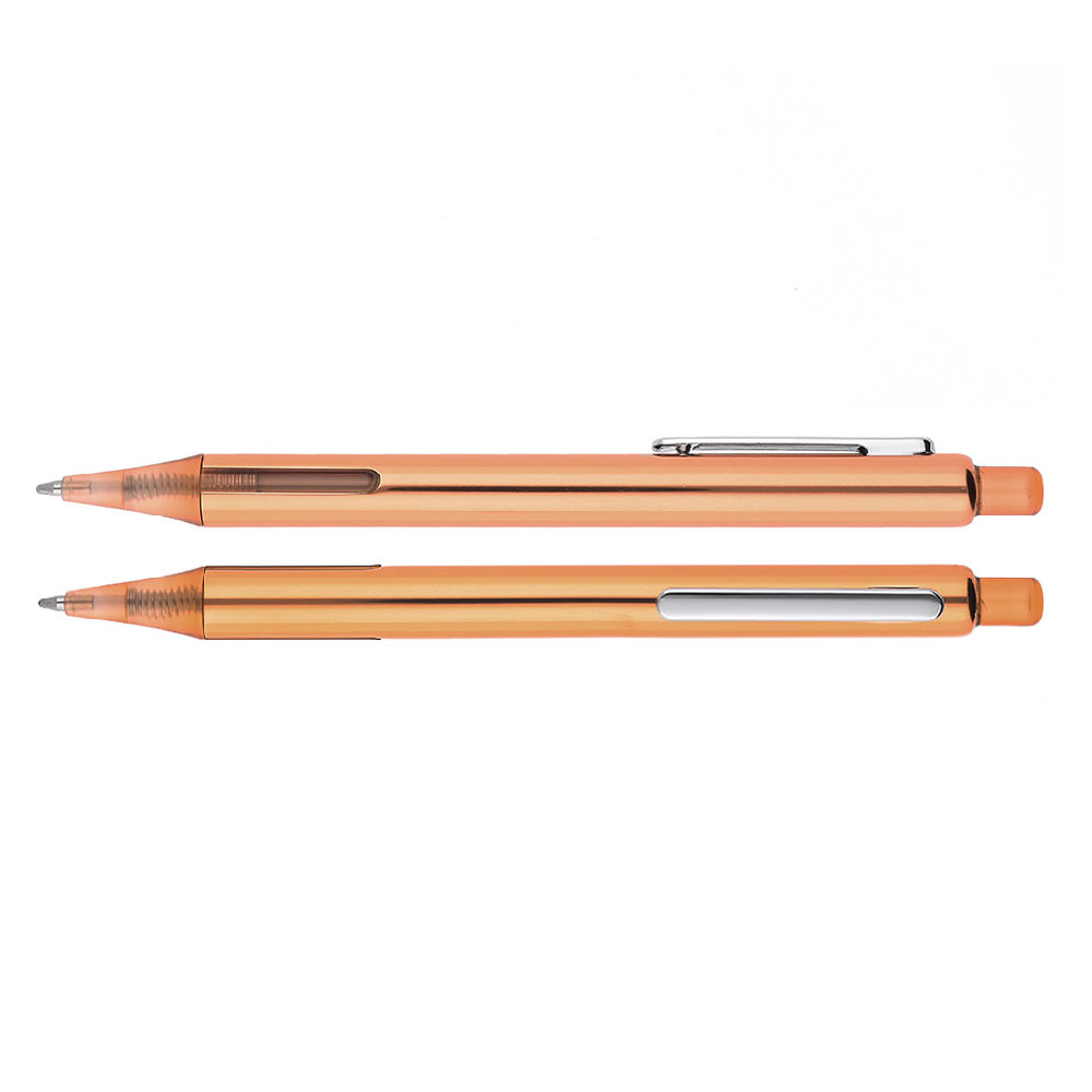 Kovové guľôčkové pero Eliana s modrou náplňou, kovovým klipom a priehľadnými plastovými časťami.