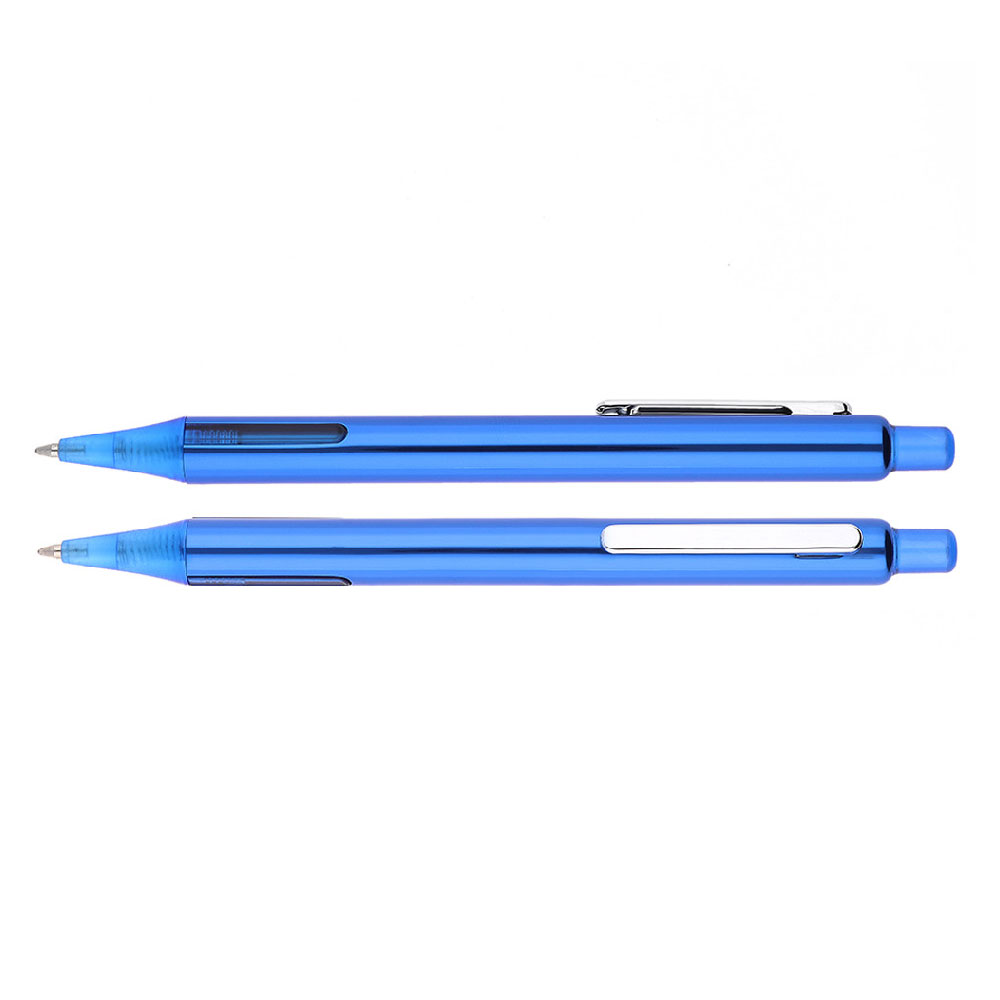 Kovové guľôčkové pero Eliana s modrou náplňou, kovovým klipom a priehľadnými plastovými časťami.