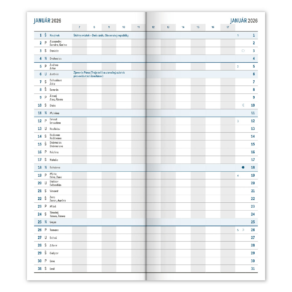 Diár obsahuje: prehľadný kalendár 2026 a 2027,