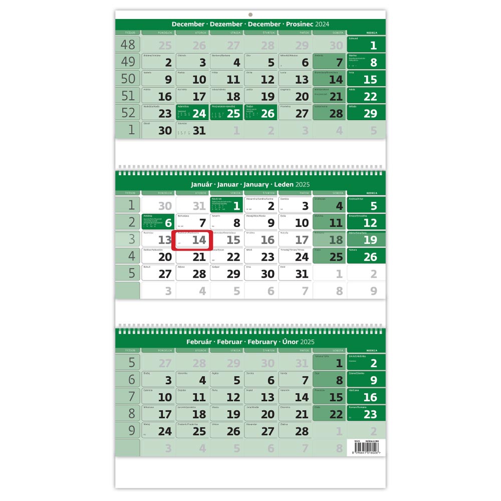 Nástenný kalendár 2025 - Trojmesačný kalendár zelený so špirálou