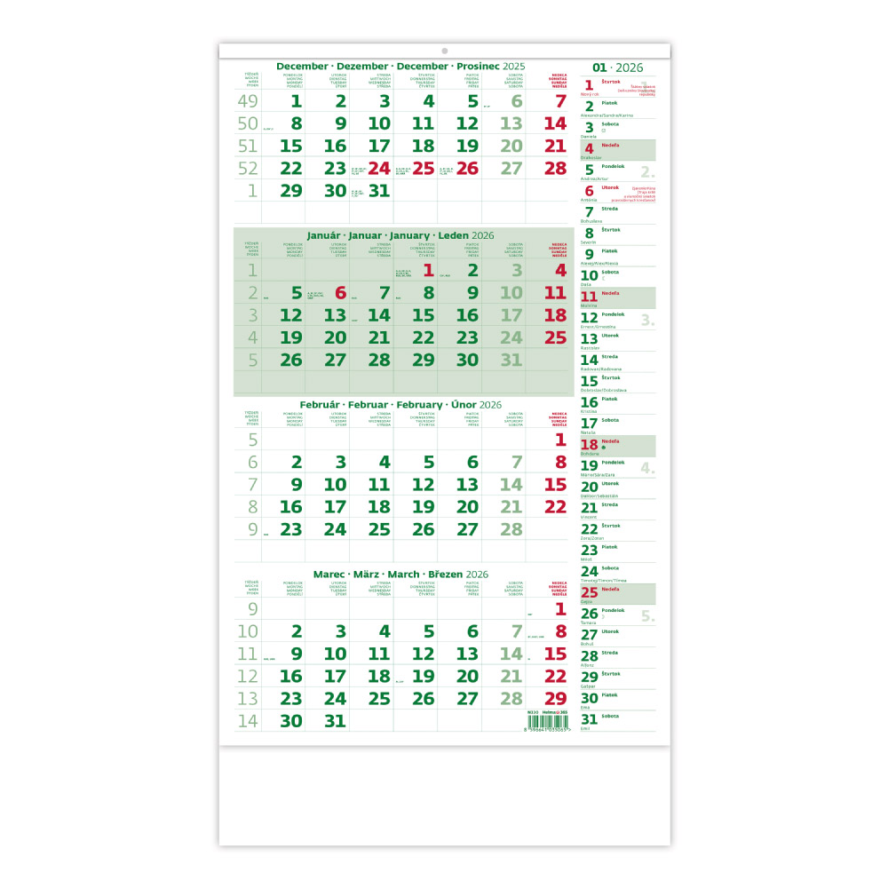 Nástěnný kalendář 2026 - Štvormesačný zelený s poznámkami