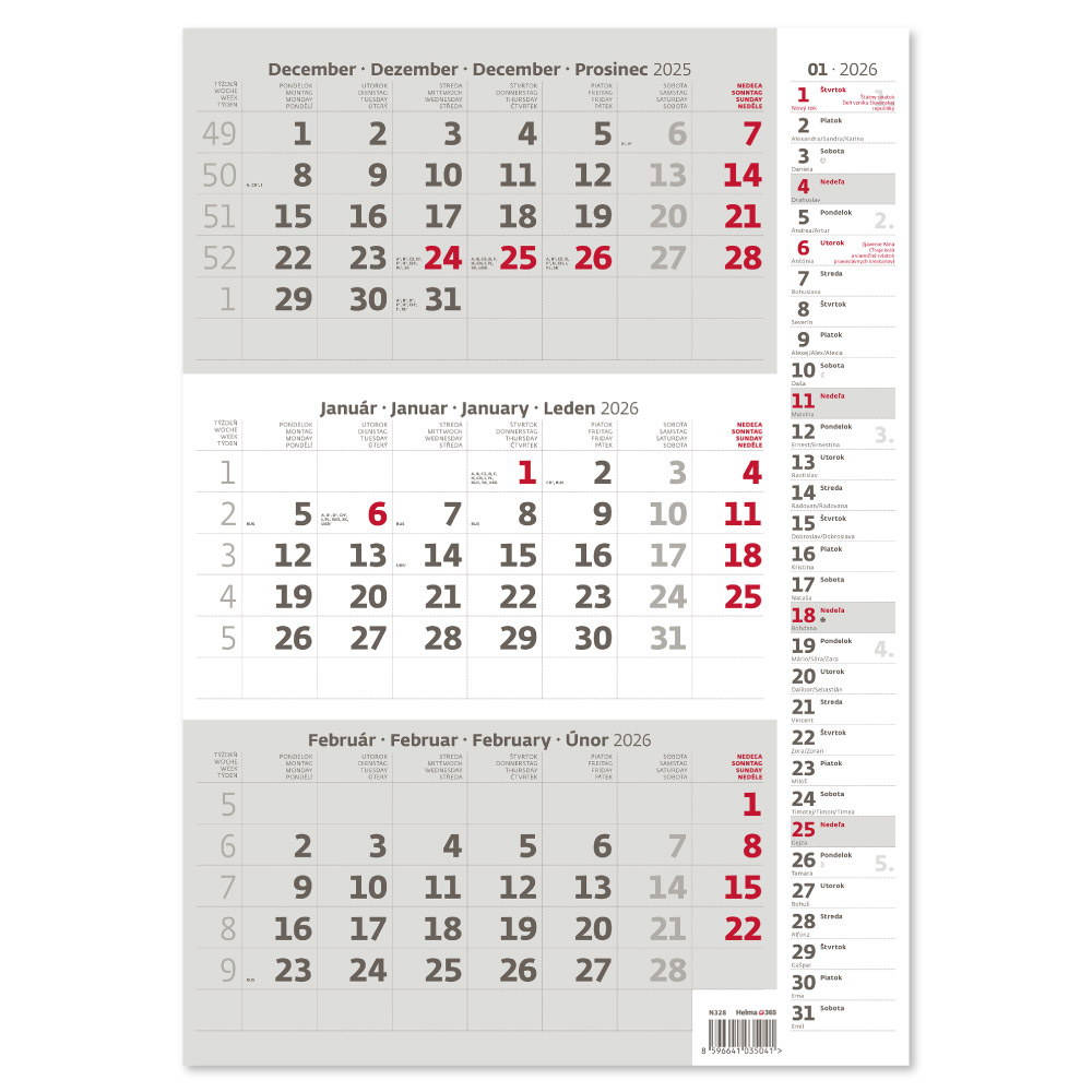 Nástenný kalendár 2026 - Trojmesačný kalendár sivý s poznámkami