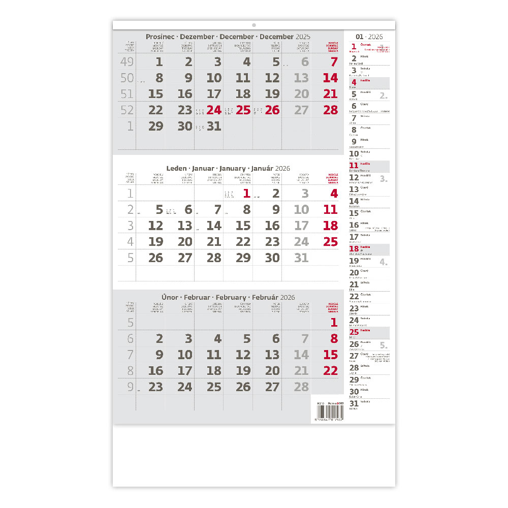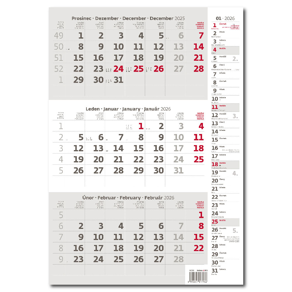 Nástenný kalendár 2026 - Trojmesačný šedý s poznámkami
