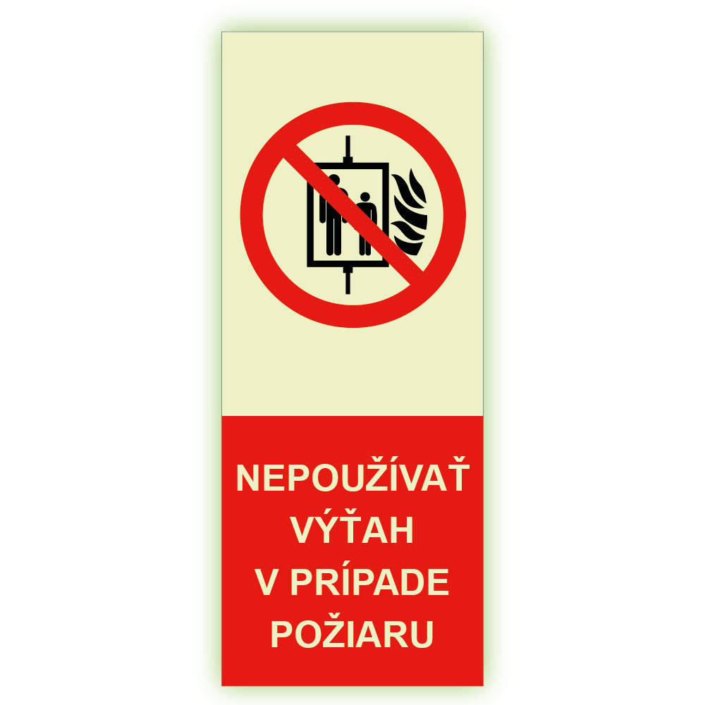 Nepoužívať výťah v prípade požiaru - fotoluminiscenčná tabuľka, samolepka 80x150 mm
