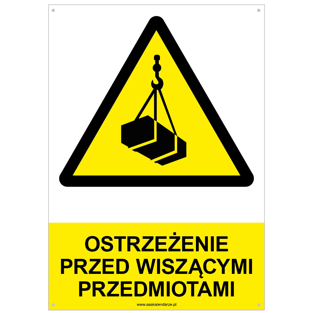 OSTRZEŻENIE PRZED WISZĄCYMI PRZEDMIOTAMI - znak BHP z dziurkami, płyta PVC A4, 2 mm