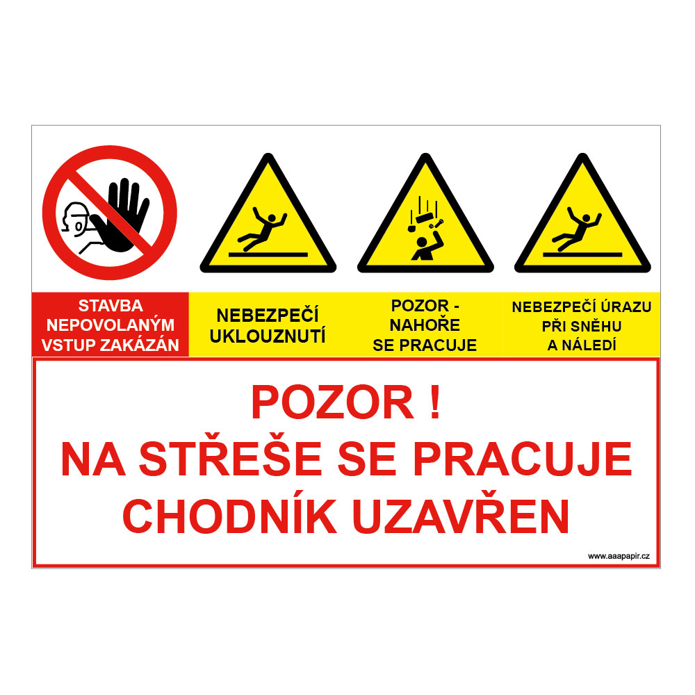 POZOR NA STŘEŠE SE PRACUJE CHODNÍK UZAVŘEN, KOMBINACE, plast 2 mm s dírkami A5