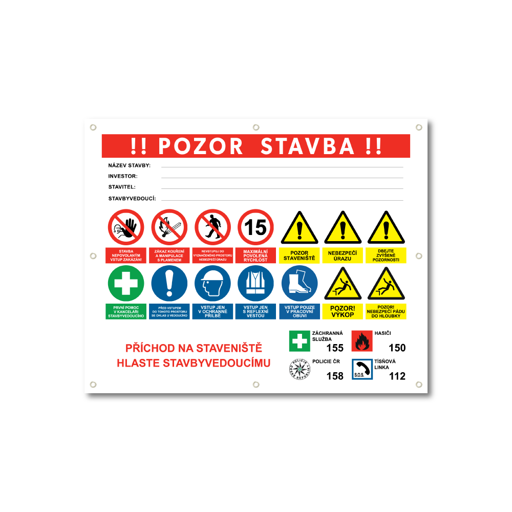 Bezpečnostní banner dodáváme bez vyplněných jmenných údajů (stavbyvedoucí, investor atd.).