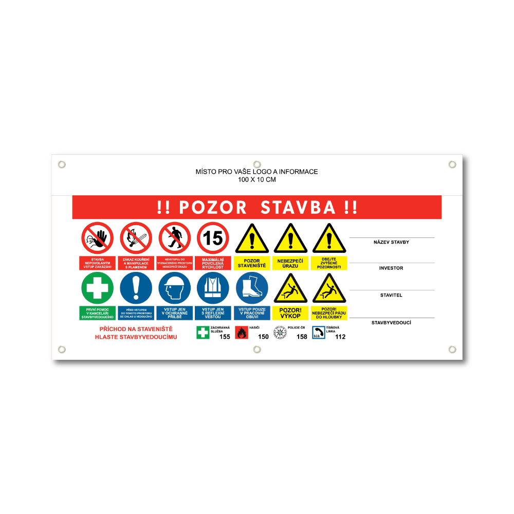 Bezpečnostní banner doplníme Vašim logem a dle přání Vám doplníme i jmenné údaje (stavbyvedoucí, investor atd.).