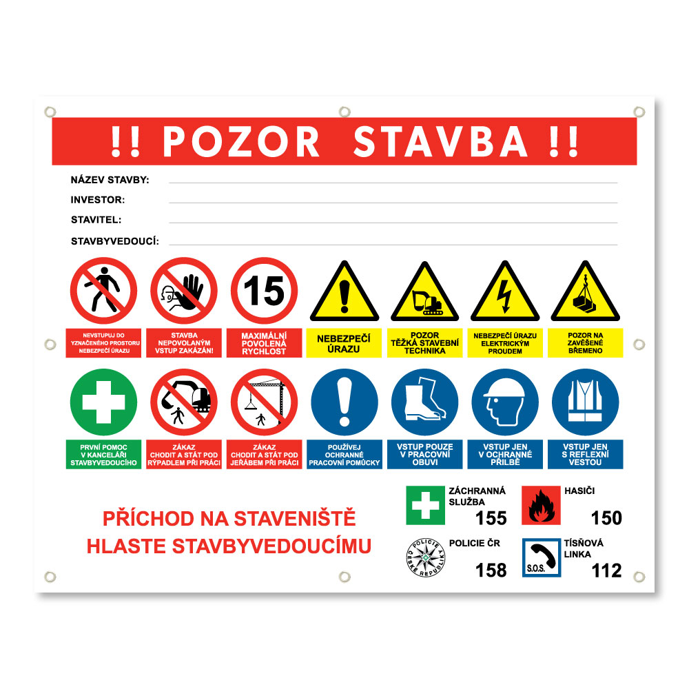 Bezpečnostní banner - areál stavby Rozměr: 100 x 80 cm Materiál: PVC 520g/m2 s trvanlivostí 5 let Tisk: UV LED s trvanlivostí 3 roky (barevná stálost). Bezpečnostní banner je opatřen kovovými očky min. každých 50 cm k jednoduchému zavěšení. Bezpečn