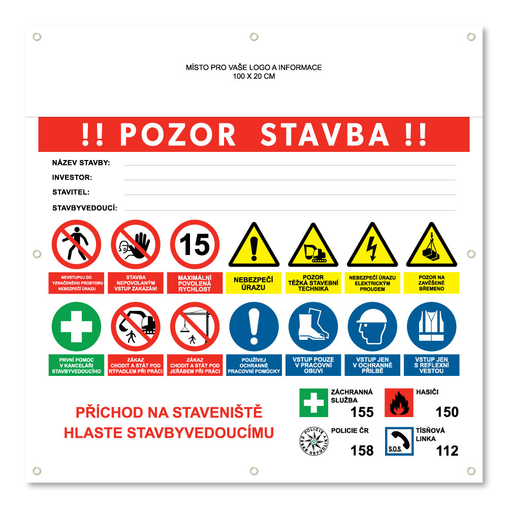 Bezpečnostní banner doplníme Vašim logem a dle přání Vám doplníme i jmenné údaje (stavbyvedoucí, investor atd.).