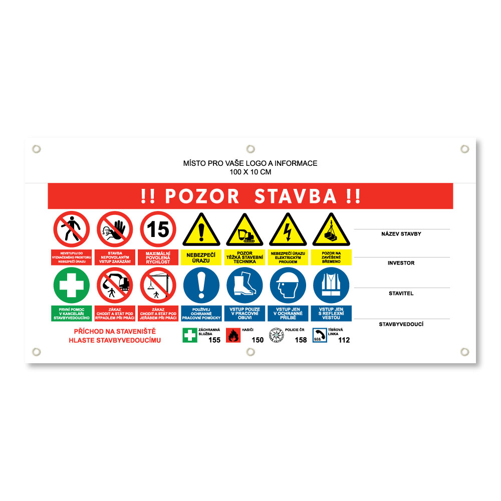 Bezpečnostní banner doplníme Vašim logem a dle přání Vám doplníme i jmenné údaje (stavbyvedoucí, investor atd.).