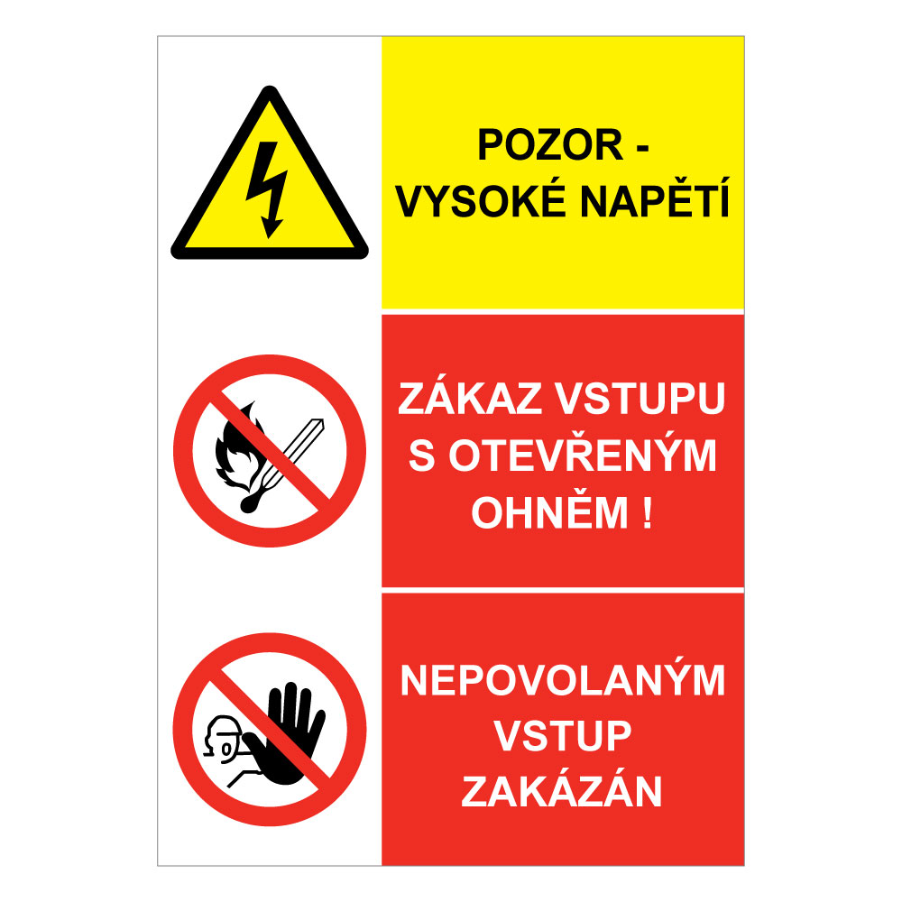 POZOR VYSOKÉ NAPĚTÍ - ZÁKAZ VSTUPU S OTEVŘENÝM OHNĚM - NEPOVOLANÝM VSTUP ZAKÁZÁN, plast 1 mm A4