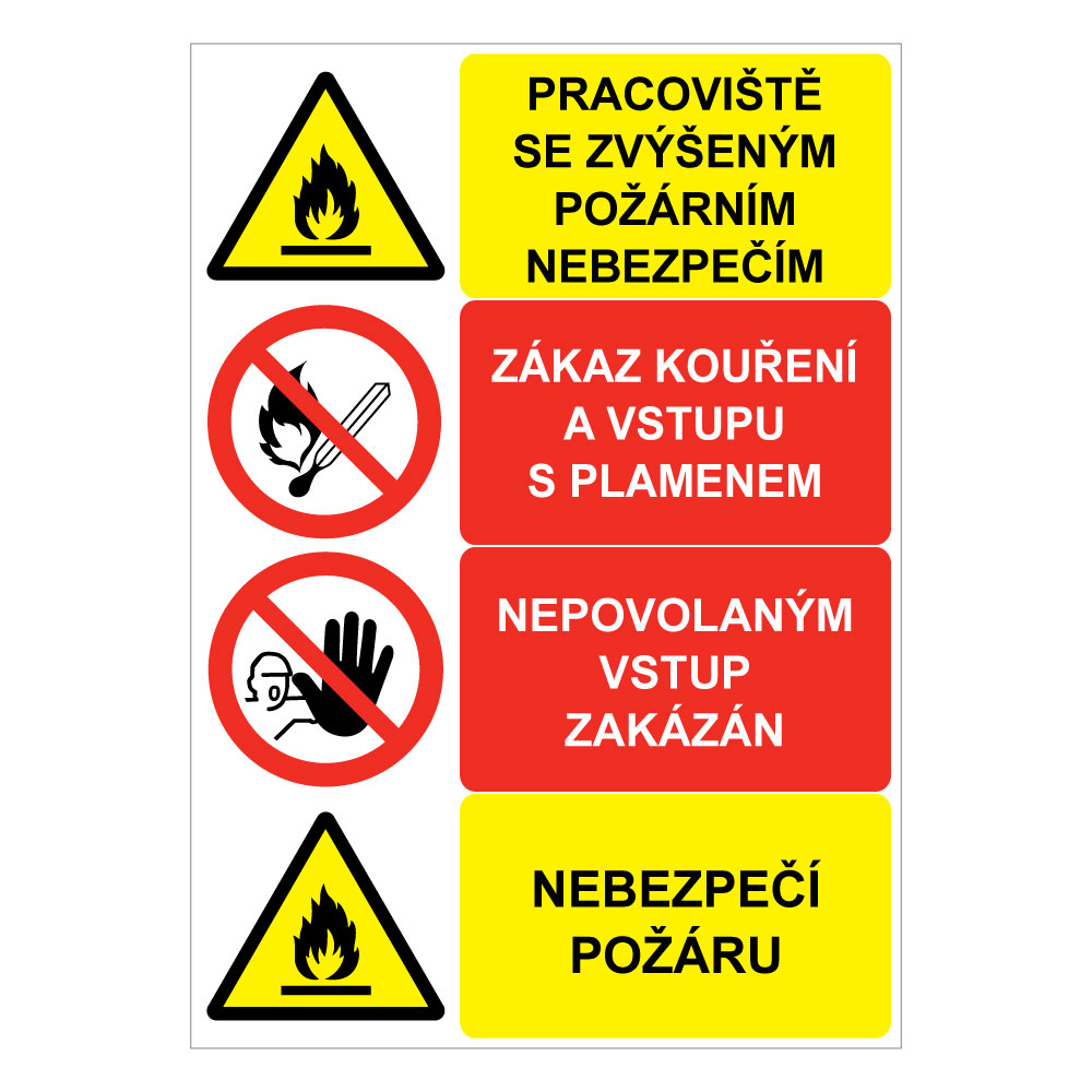 PRACOVIŠTĚ SE ZVÝŠENÝM POŽÁRNÍM NEBEZPEČÍM - ZÁKAZ KOUŘENÍ -NEPOVOLANÝM - NEBEZPEČÍ, plast 2 mm s dírkami, A4